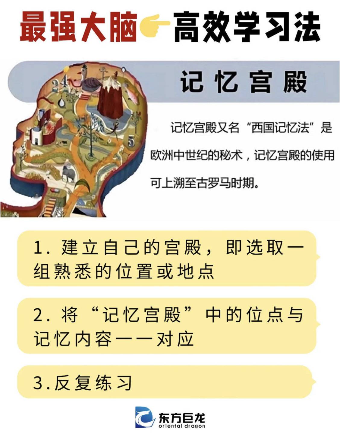 它源自古希臘,也叫定位記憶法。核心邏輯是利用大腦天生擅長記住空間位置的特點,把需要記憶的抽象資訊,轉化成生動的圖像,安放在你熟悉的路徑或空間裡。